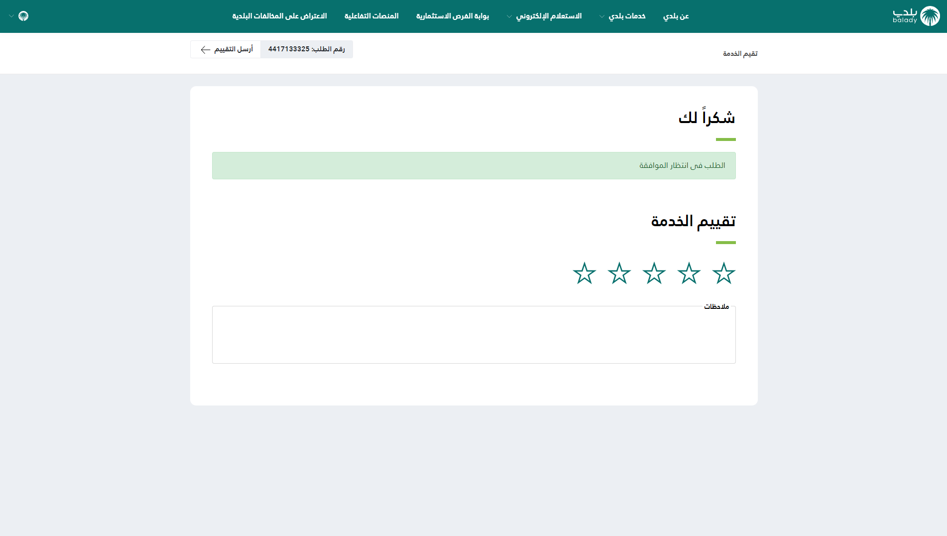 50) وبعدها يقوم النظام بإرسال الطلب، مع إظهار رسالة تفيد بذلك، كما في الشكل أدناه، كما يسمح النظام للمستخدم بتقييم الخدمة من خلال اختيار عدد النجوم الظاهرة له، وإدخال ملاحظاته في الحقل (ملاحظات)، ثم الضغط على الزر (أرسل التقييم).