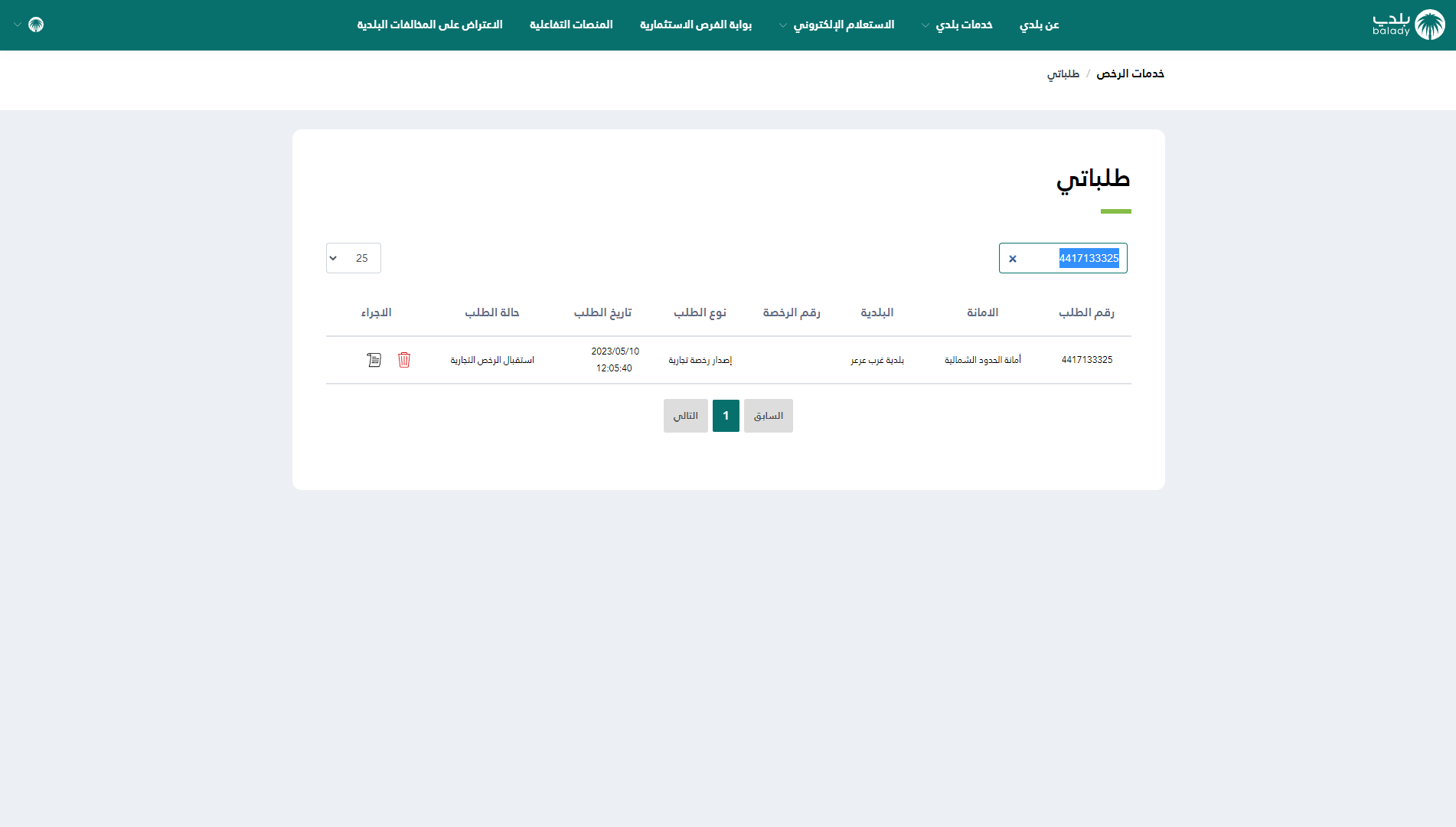 1) ويمكن للمستخدم متابعة الطلب من خلال شاشة (طلباتي) كما في الشكل التالي، حيث تكون حالة الطلب هي (استقبال الرخص التجارية)، ويمكن عرض تفاصيل الطلب من خلال الضغط على شكل الورقة في العمود (الإجراء).
