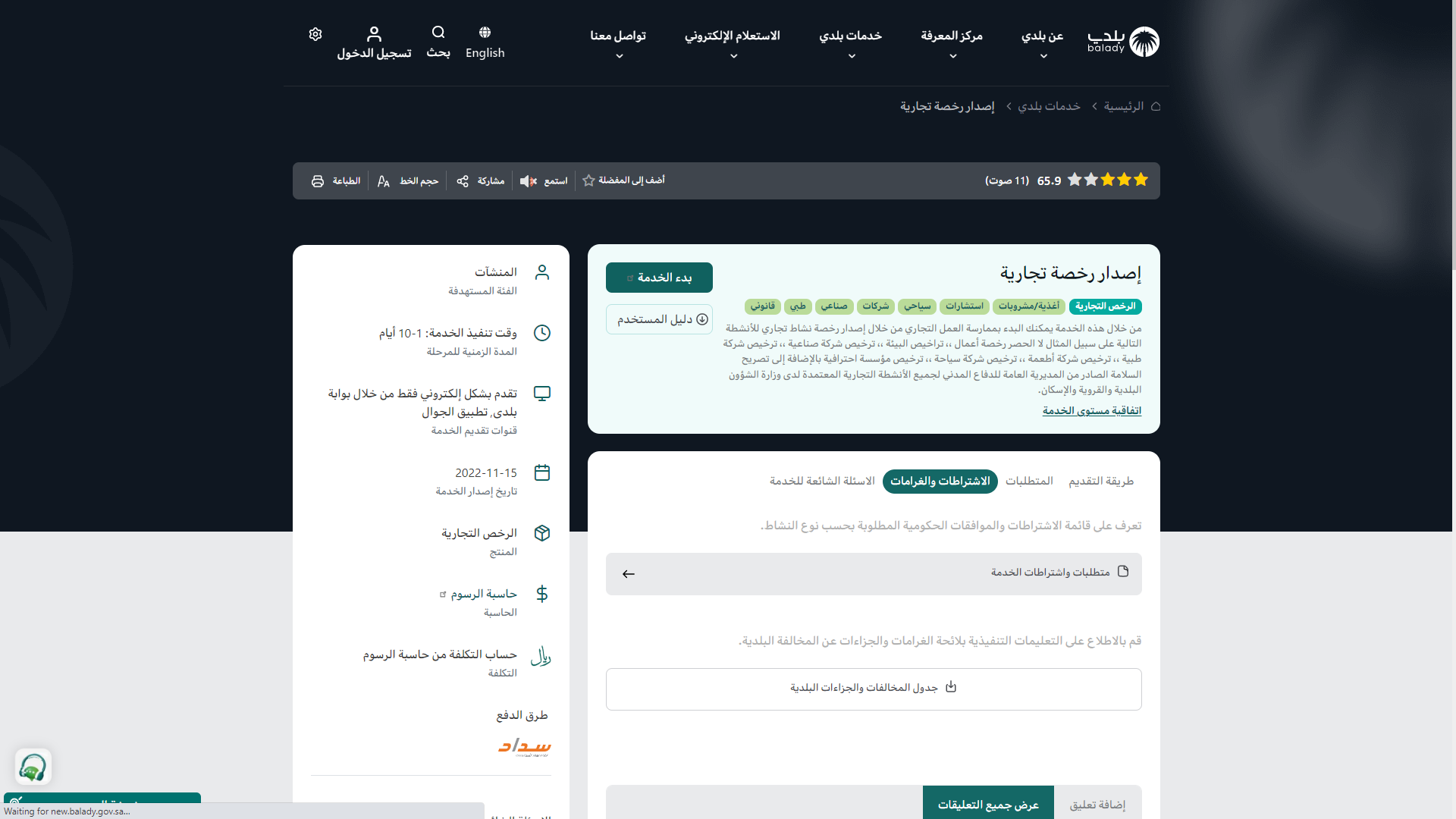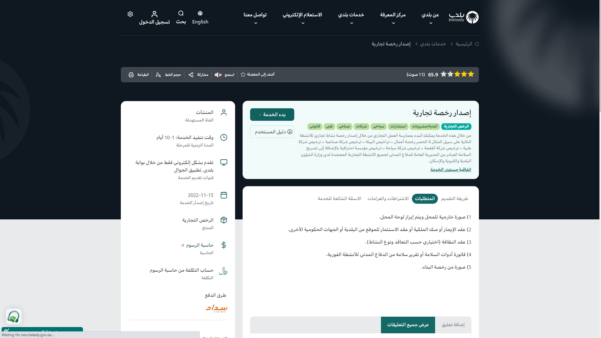 6) بعدها تظهر الشاشة التالية، والتي تمثل شاشة التعريف بالخدمة، حيث يمكن للمستخدم معرفة أحد متطلبات الخدمة من خلال القوائم (طريقة التقديم، المتطلبات، الاشتراطات والغرامات .. إلخ).
